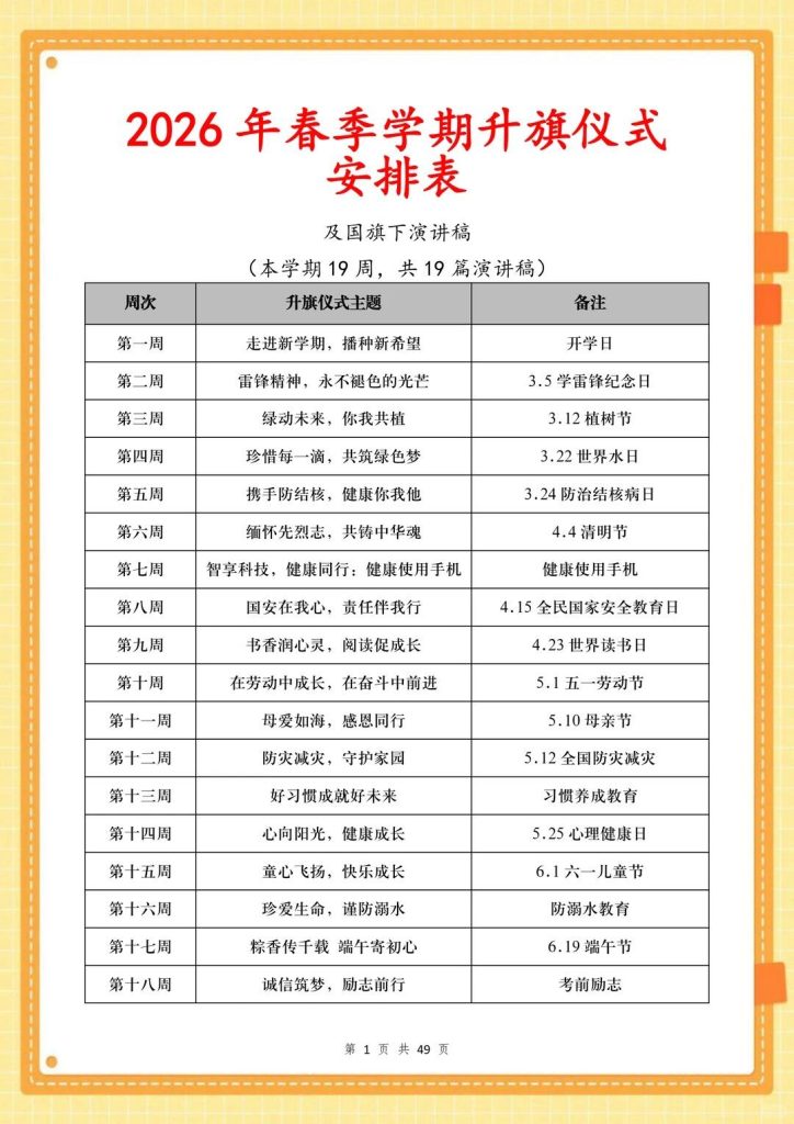2026年春季升旗仪式安排表+国旗下讲稿 2026-02-10 教育教学 4 资源下载此资源仅限终身VIP下载,请先登录 资源下载下载价格终身VIP专享仅限终身VIP下载升级终身VIP请先登录 原文链接:https://ruanjian6.com/6614/.html,转载请注明出处。 0