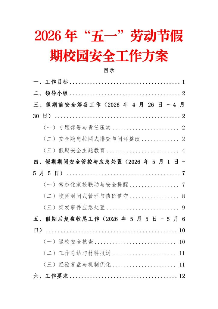 2026年五一劳动节假期校园安全工作方案 2026-04-27 教育教学 6 资源下载此资源仅限终身VIP下载,请先登录 资源下载下载价格终身VIP专享仅限终身VIP下载升级终身VIP请先登录 原文链接:https://ruanjian6.com/7524/.html,转载请注明出处。 0